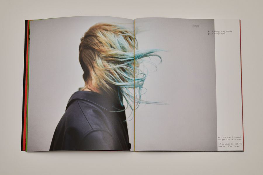 The book has been cut with accentuated dovetailing so that when viewed flat the elements of previous and future pages seep in to the current reading. The colours throughout this book are a subtle nod to the Tallaght flag and the yellow binding band represents a through line of elasticated and malleable memory, only serving to temporarily hold the story together until interacted with.